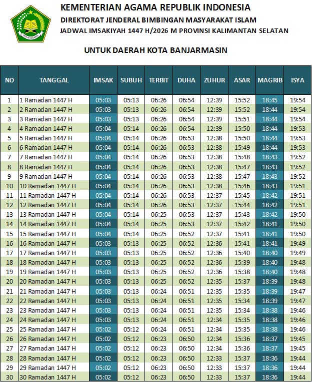 Salah satu hal penting yang perlu kita siapkan dan kita ketahui selama bulan Ramadhan adalah jadwal imsakiyah. Dengan jadwal imsakiyah Banjarmasin Ramadhan 2026, umat Islam yang berdomisili di kota Banjarmasin bisa mempersiapkan pribadi dan keluarga untuk sahur, menyegerakan berbuka, dan shalat di awal waktu.